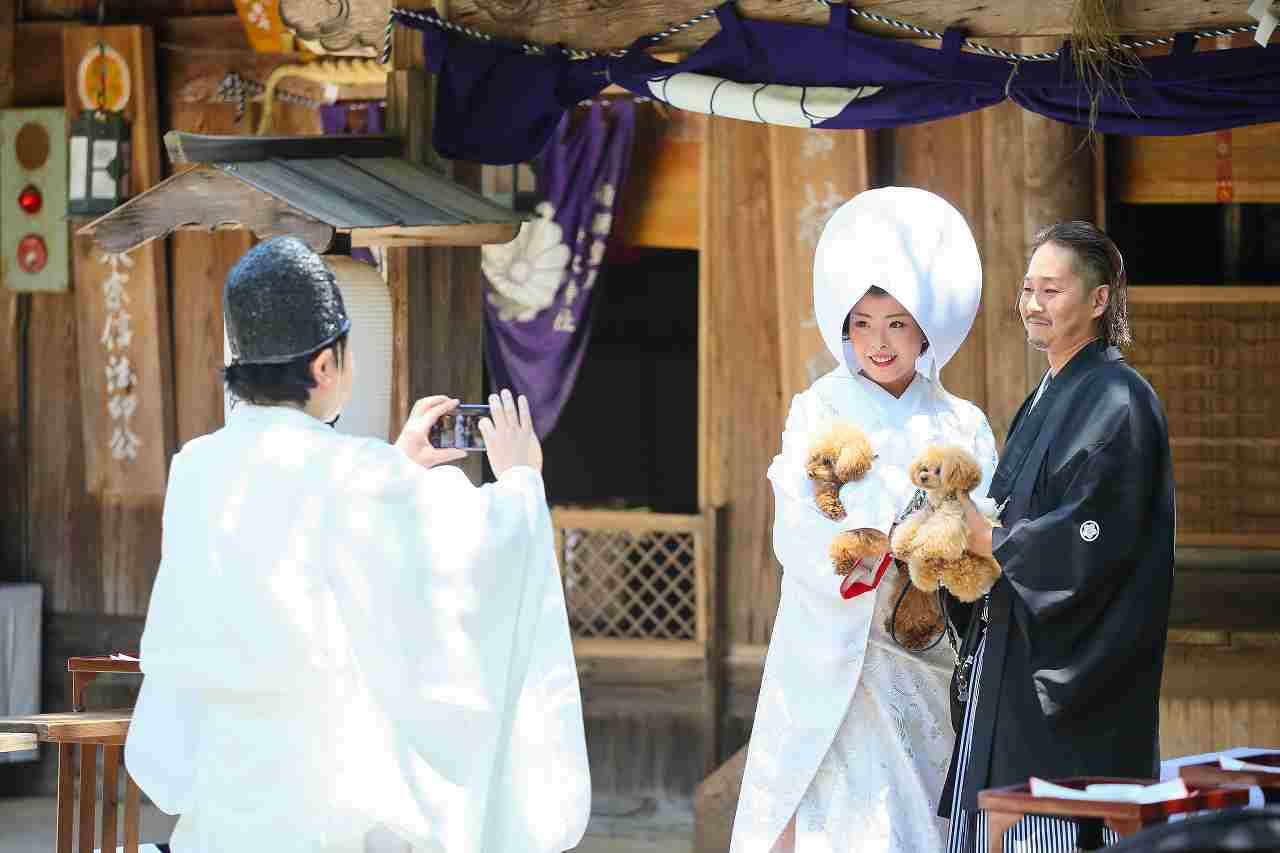 ペット(愛犬)同伴の結婚式 2026/03/02 後醍醐天皇の玉座前 ペット(愛犬)同伴の結婚式 抱っこしていただければペット同伴の結婚式も可能です こちらは奈良県吉野の吉水神社 宮司様も記念撮影 本殿前 宮司さん自ら撮影してくれます 京都の八大神社、宗忠神社も可能です